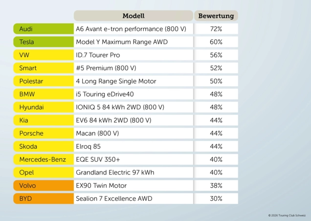 Der Vergleich macht deutlich, dass Top-Ergebnisse im Winter nicht automatisch vom Marktsegment eines Fahrzeugs abhängen. Mehrere Modelle im oberen Bereich kombinieren einen kontrollierten Verbrauch mit effizientem Laden, während andere, grössere und schwerere Fahrzeuge trotz grosser Batteriekapazität durch mangelnde Effizienz zurückgeworfen werden.